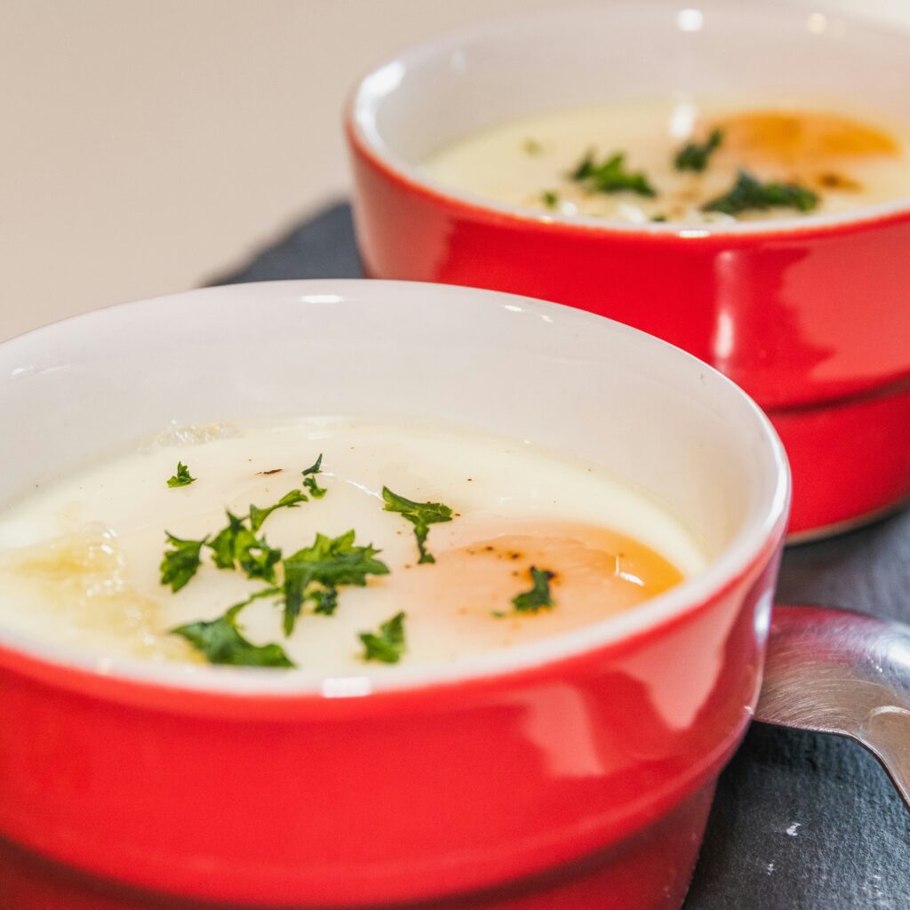 Kupayı düz tabak üzerine yerleştir, yanına kızarmış ekmek dilimi koy.